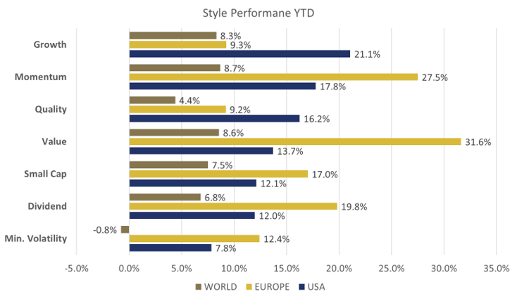 Notably, the MSCI World Quality index in EUR barely crossed 0%, showing that even AI tailwinds could not generate high returns. Currency movements further weighed on European investors, as the USD declined sharply against the EUR and CHF—a pace not seen in several years, as interest rates in US trended downward.
